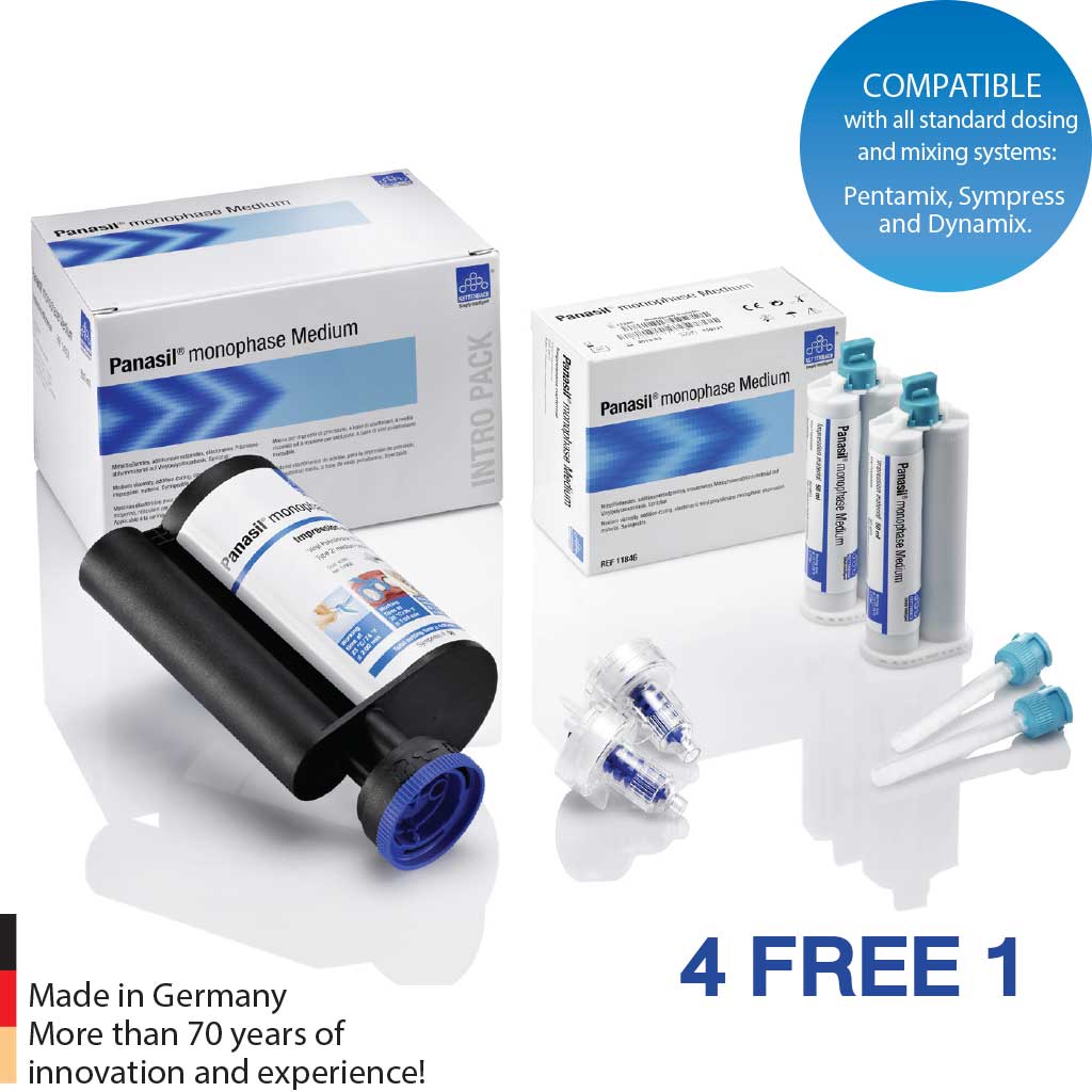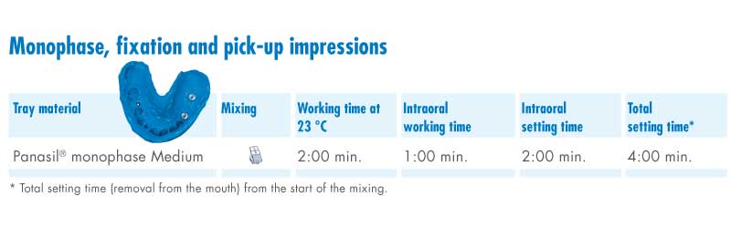 PRODUCT PROPERTIES Panasil® monophase Medium is an syringeable, medium-viscosity, addition-curing monophase impression material. MAIN AREAS OF USE Panasil® monophase Medium is developed for the well known monophase impression technique and ideally suited for precise transfer impresion: Short intraoral setting time Short Setting time reduces stress for your patients    Less distortion during the setting time High Shore-A hardness √ Shore-A hardness of 60 for good fixation of primary crowns and secure fit Neutral smell and taste Greater patient acceptance and better results thanks to reduced gag reflex and movements Initial hydrophilicity Immediate activation on primary crowns, impression posts,or preparation margins, deep into the sulcus even in a moist environment